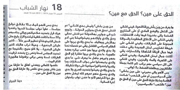 من وين بلش؟ وليش بدي اشكي؟ عم فتش عحق ضاع بجوارير الدولة… ولووو شو في جوارير بهالدولة! عم فتش عحقي وحق ولادي وأولادهم يعيشواعيشة بني آدم بهالارض وبهالبلد. ما بدي ولادي يربوا على الطقم السياسي الفاشل يللي عم نتحمله نحنا ولا بدي ولادي يربوا بجو شعب بيكره بعضه عالهوية. ما بدي ولادي يربوا عفكرة إنو الحق معهم وغيرهم جاهل ما بيعرف شي. ما بدي ولادي يتبهدلوا على بواب السفارات وما يقدروا ياخدوا فيزا سياحية على دولة شقيقة. ما بدي ولادي يعيشوا بتمديد قصري ولا بدي ولادي ينسرق منهم عمرهم كله تيضل معهم حق دوا لآخرتهم لأنو ما عندن نواب يأمنولن آخرة انسانية.