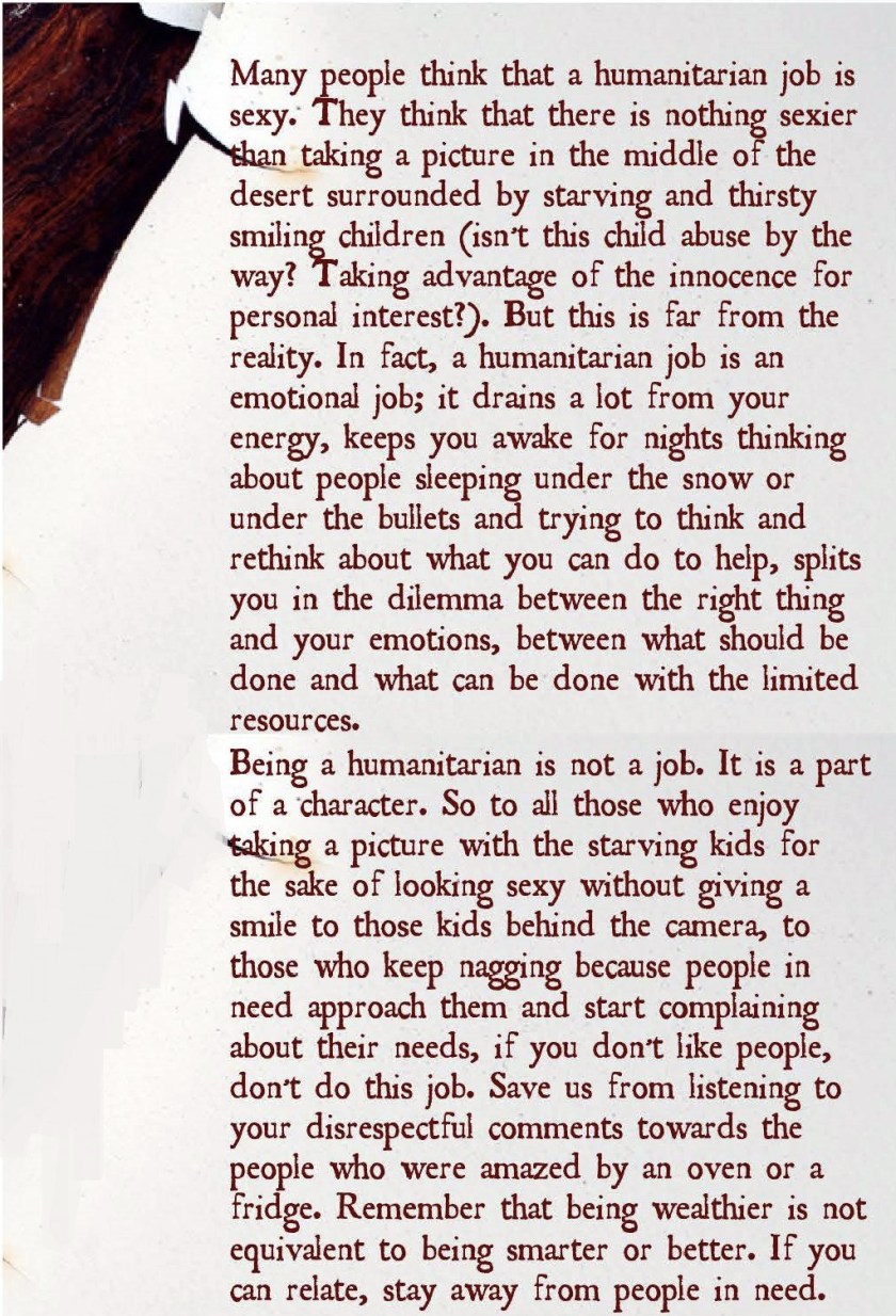 Many people think that a humanitarian job is sexy. They think that there is nothing sexier than taking a picture in the middle of the desert surrounded by starving and thirsty smiling children (isn’t this child abuse by the way? Taking advantage of the innocence for personal interest?). But this is far from the reality. In fact, a humanitarian job is an emotional job; it drains a lot from your energy, keeps you awake for nights thinking about people sleeping under the snow or under the bullets and trying to think and rethink about what you can do to help, splits you in the dilemma between the right thing and your emotions, between what should be done and what can be done with the limited resources.