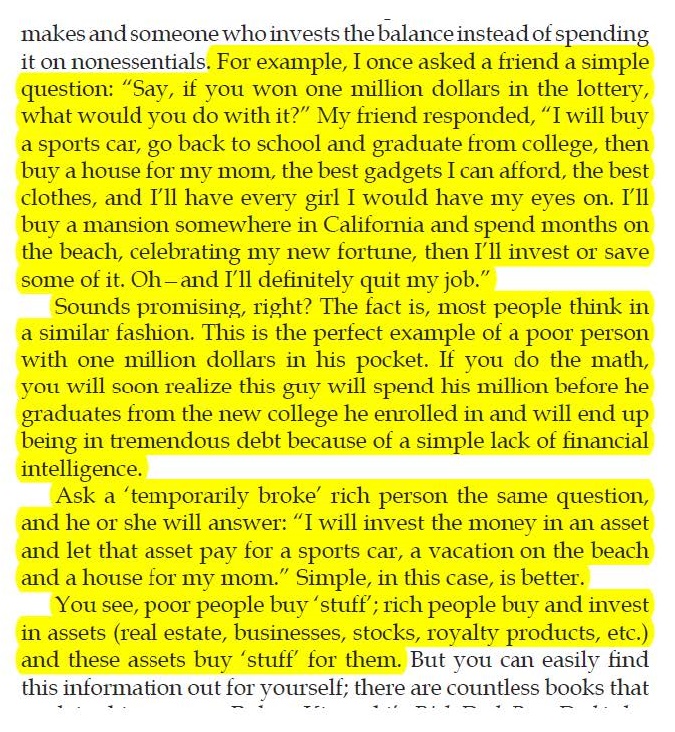 You see, poor people buy ‘stuff’; rich people buy and invest in assets (real estate, businesses, stocks, royalty products, etc.) and these assets buy ‘stuff’ for them.”