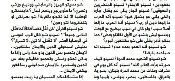 شو؟ نسيتو؟ شو نسيتو الحرب؟ نسيتو كم أم وأب احترق قلبهم على اولادهم يللي في منهم بعدن لهلق مفقودين؟ نسيتو الايتام؟ نسيتو المتضررين والمعوقين؟ نسيتو